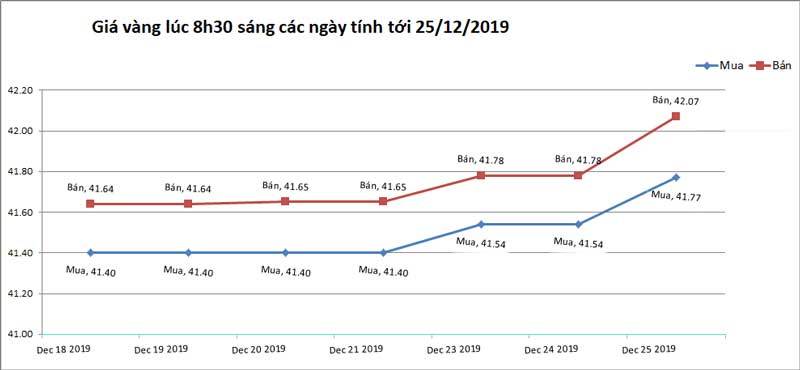 Tính tới cuối phiên giao dịch 25/12, Tập Đoàn Vàng bạc đá quý DOJI niêm yết giá vàng SJC ở mức: 41,90 triệu đồng/lượng (mua vào) và 42,10 triệu đồng/lượng (bán ra). Công ty vàng bạc đá quý Sài Gòn niêm yết vàng SJC ở mức: 41,85 triệu đồng/lượng (mua vào) và 42,14 triệu đồng/lượng (bán ra).