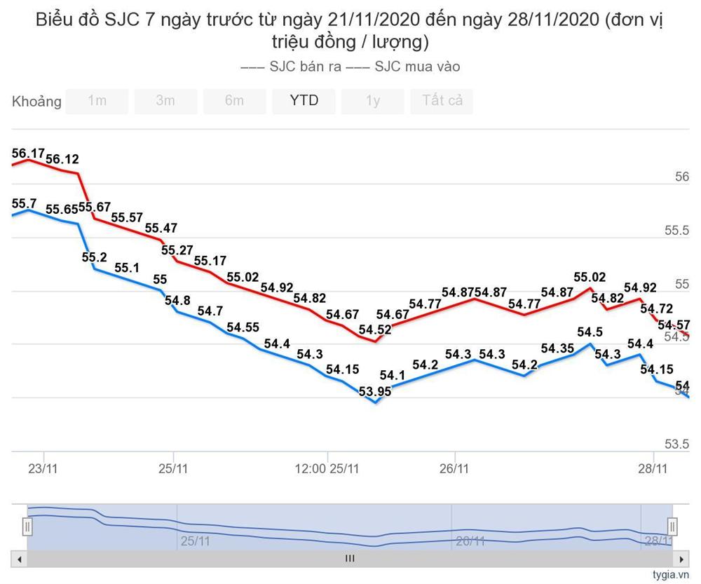 Các phiên sau đó, giá vàng liên tục giảm. Ngày 25/11, giá vàng miếng trong nước được Tập Đoàn Vàng bạc đá quý Doji niêm yết cho khu vực Hà Nội ở mức: 54,80 triệu đồng/lượng (mua vào) và 55,25 triệu đồng/lượng (bán ra), giảm 200 nghìn đồng ở chiều mua vào và giảm 150 nghìn đồng chiều bán ra so với cuối phiên liền trước.