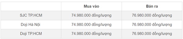 Doji niêm yết ở mức 74,98 triệu đồng/lượng (mua vào) và 76,98 triệu đồng/lượng (bán ra).