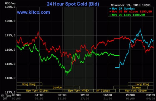Tính tới 5h10 sáng 30/11 (giờ Việt Nam), giá vàng giao ngay đứng ở mức 1.187,9 USD/ounce sau một phiên giảm sâu trên thị trường Mỹ trước đó. Đêm qua, giá vàng có lúc giảm xuống sát 1.180 USD/ounce.