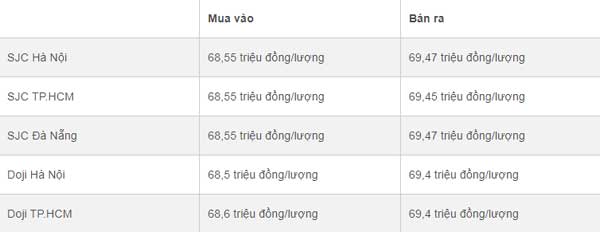 SJC Hà Nội: 68,60 triệu đồng/lượng - 69,52 triệu đồng/lượng