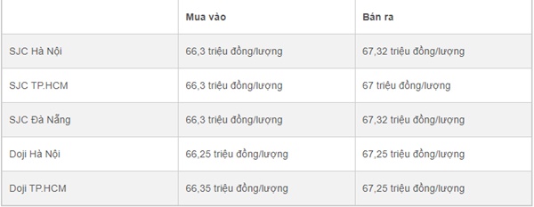 Doji Hà Nội niêm yết ở mức 66,25 triệu đồng/lượng (mua vào) - 67,25 triệu đồng/lượng (bán ra).