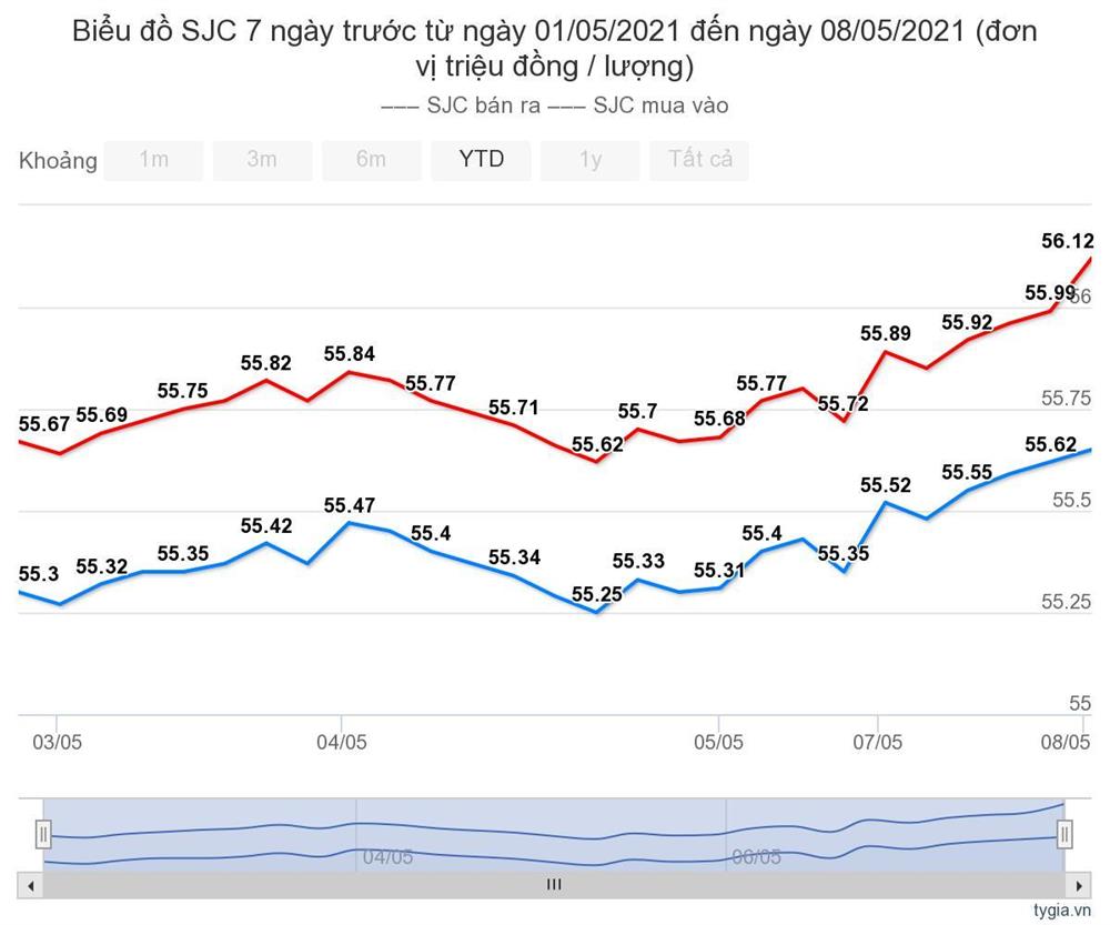 Giá vàng tiếp tục tăng các phiên tiếp theo. Ngày 6/5, giá vàng miếng trong nước được Tập đoàn Vàng bạc đá quý Doji niêm yết cho khu vực Hà Nội ở mức: 55,45 triệu đồng/lượng (mua vào) và 55,75 triệu đồng/lượng (bán ra). Công ty vàng bạc đá quý Sài Gòn niêm yết giá vàng SJC áp dụng cho khu vực Hà Nội ở mức 55,43 triệu đồng/lượng (mua vào) và 55,80 triệu đồng/lượng (bán ra).