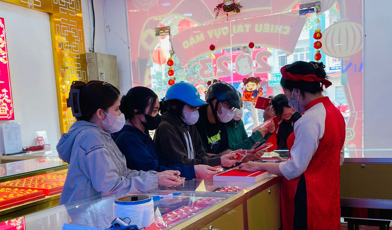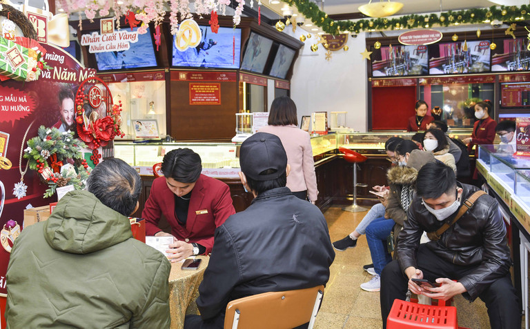 Đến trưa 22/12, giá vàng 9999 của SJC tại Hà Nội tăng thêm 700.000 đồng/lượng, lên mốc 77 triệu đồng/lượng chiều bán ra. Bất chấp giá vàng cao chót vót, tại một số cửa hàng lớn vẫn xuất hiện cảnh mọi người ngồi xếp hàng chờ mua bán vàng. Trong đó, lượng người tới mua vàng nhiều hơn người tới bán.