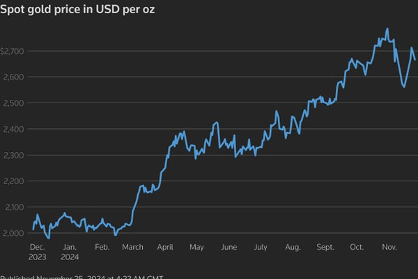 Trong phiên giao dịch ngày 25/11, giá vàng giao ngay giảm 1,52% xuống còn 2.671,29 USD/ounce. Giá vàng tương lai của Mỹ giảm 1,5% xuống còn 2.672,90 USD.