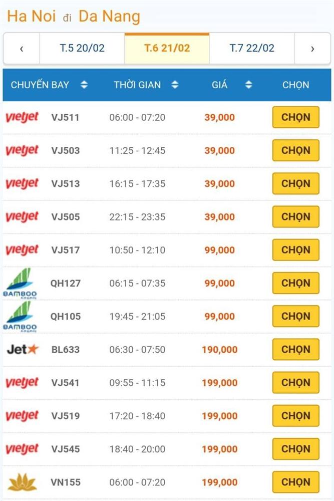 Bamboo Airway khởi hành 5h45 phút sáng 21/2 là 199 ngàn đồng. Vietjet Air khởi hành 5h05 phút ngày 21/2 là 299 ngàn đồng.