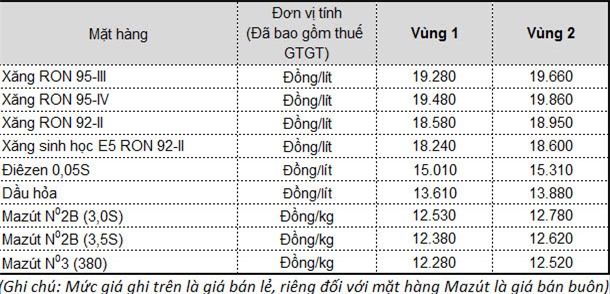 Riêng dầu diesel 0.05S không cao hơn 15.019 đồng/lít; dầu hỏa không cao hơn 13.617 đồng/lít và dầu mazut 180CST 3.5S không cao hơn 12.382 đồng/kg.