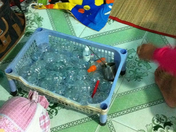 6h30 sáng, điểm giác hơi của bà Nguyễn Thị Kim Ngà (P.Cát Lái, Q.2, TPHCM) đã có khách. Trong căn phòng chật hẹp bề bộn, một mảnh chiếu nhỏ được trải xuống nền gạch và bộ đồ nghề là lọ cồn 90 độ, 2 chai dầu thoa da, cùng rổ ống giác hơi nhem nhuốc, được dùng chung cho nhiều khách và không sát trùng lại sau mỗi ca GH.