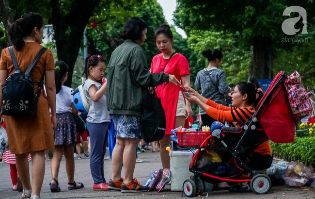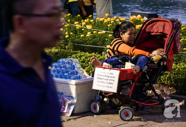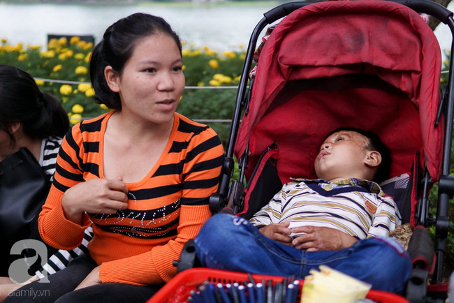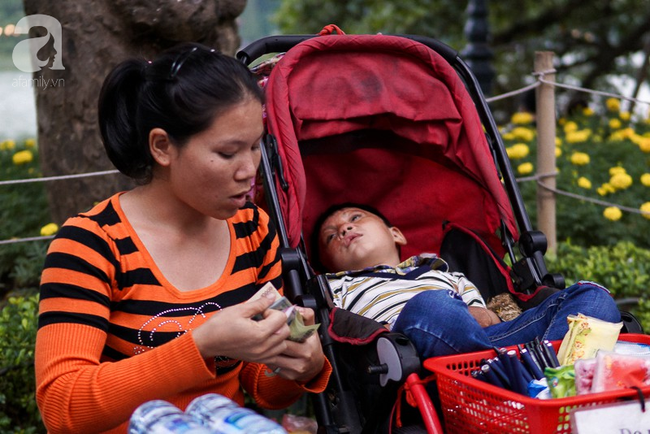 Nhưng em nói thật, còn đầy người ngoài kia khổ hơn gia đình em nhiều, nên em xin ra khỏi hộ nghèo, rồi bế con ra đây để bán hàng. Hồi đầu cũng khó khăn lắm, bị đuổi suốt, nhưng sau biết hoàn cảnh của mẹ con em nên mọi người xung quanh lại giúp đỡ. Cứ cuối tuần mẹ con em lại ra đây, đứa lớn gửi đi học, tối muộn 11 - 12h chồng em lại đến đón về. Vất vả mấy em cũng chịu được, chỉ mong tích cóp được nhiều tiền cho cháu".