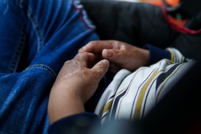 "Đợt ấy gần Tết rồi, năm 2015. Hàng xóm sang mượn bếp ga nhà em để nấu ăn, nhưng lại không khóa van lại, còn vặn hở ra, khí ga bị rò rỉ không ai biết. Trời lạnh nên em mới định đốt lửa sưởi cho con, khi đó Hòa mới được 1 tuổi 2 tháng, nhưng lửa bắt phải hơi ga nên bùng cháy, cháy cả nhà luôn. Con trai em đứng gần quá nên lửa bắn vào cháu, may là cháu biết lấy tay che mặt nên bị bỏng hết tay, với phần da trán nữa, giờ thành sẹo co hết cả vào nên cháu không thể nhắm được mắt".
