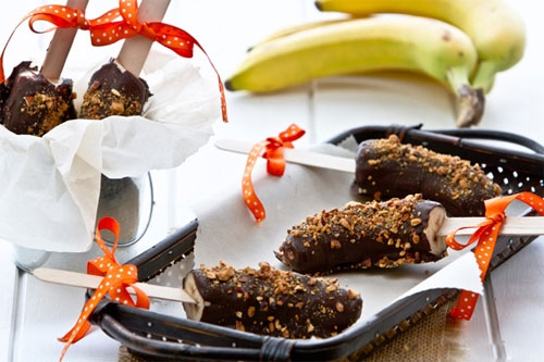 – Đun chảy sô cô la rồi bỏ chuối từ tủ lạnh ra, nhúng từng que một vào sô cô la sao cho sô cô la bám đều xung quanh, sau đó lăn que kem vào đĩa đựng hạt điều vụn.