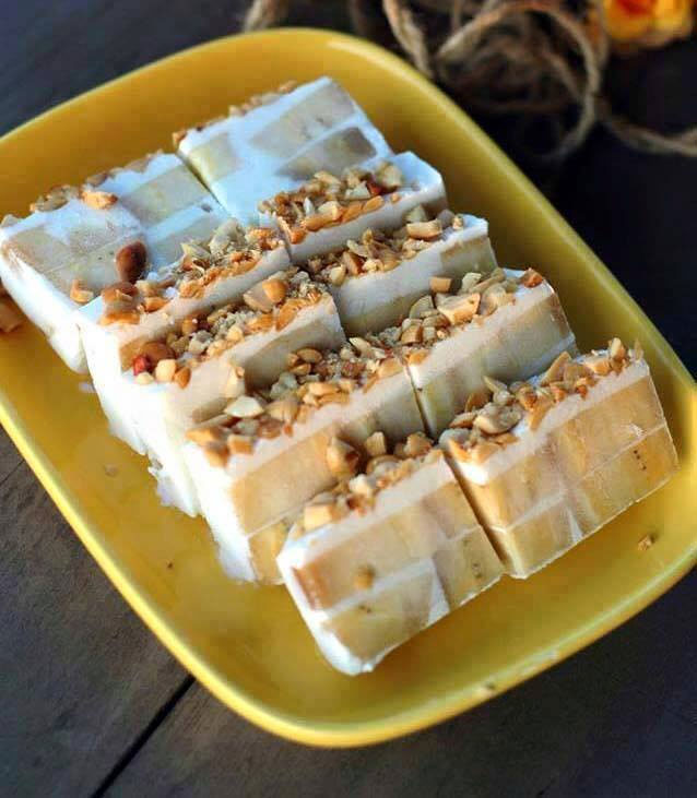 - Rưới thêm ít sữa đặc.Rắc dừa nạo và đậu phộng đã giã sơ lên. Gói lại bỏ tủ lạnh ngăn đông 2 tiếng.