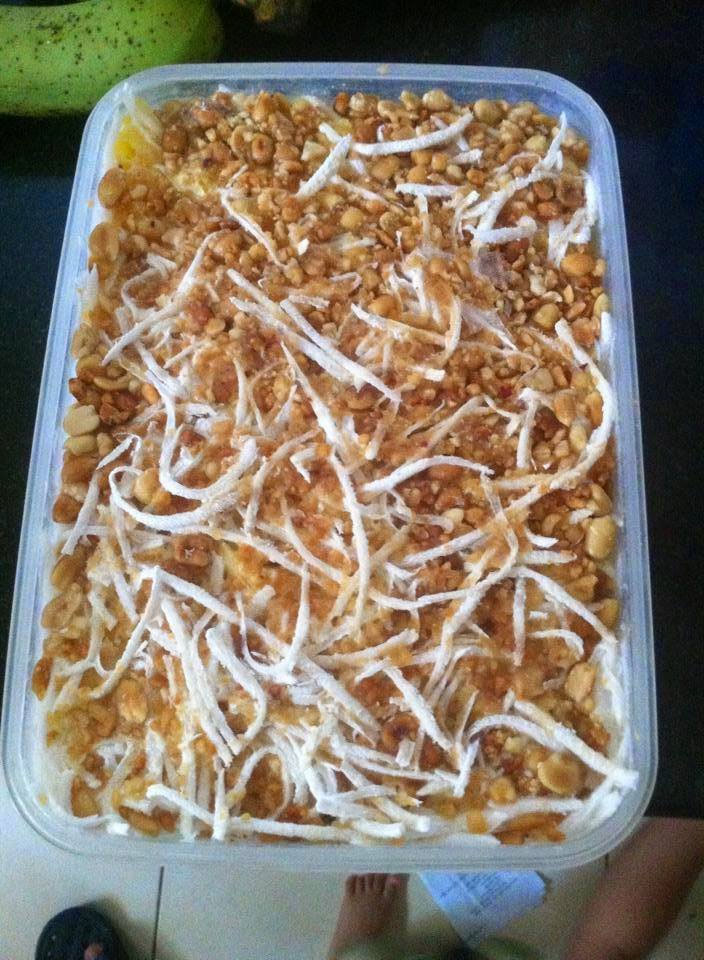 Rắc dừa nạo lên trên lớp dứa, đổ 1/2 hỗn hợp cốt dừa vừa pha vào, tiếp tục lớp thứ 2. Cuối cùng rắc lạc rang. Cho cả hộp để lên ngăn đá khoảng 5 tiếng là có thể đem ra ăn được.