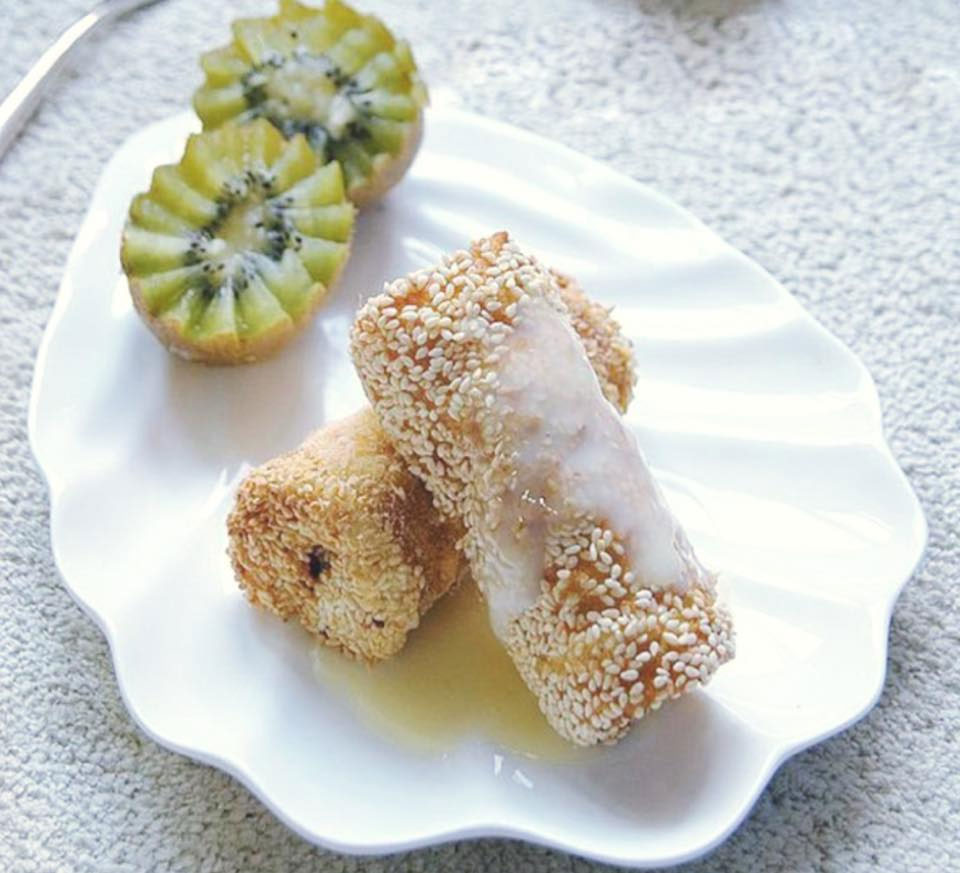 - Nhúng cuộn bánh mỳ vào bát trứng, tiếp đó lăn qua vừng tạo thành một lớp áo mỏng bên ngoài.