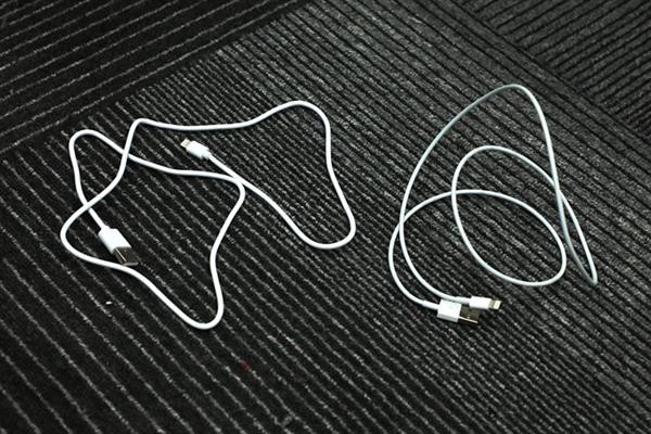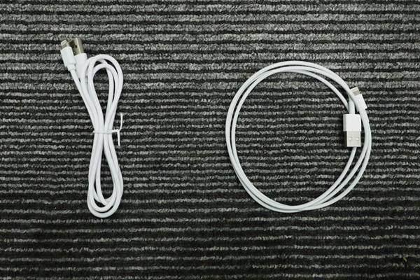 Độ mềm của hai loại dây cáp cũng khác nhau. Bức hình này có thể mô tả phần nào trạng thái đó. Bên trái là dây giá rẻ, mềm yếu và gần như dính xuống đất khi rơi xuống. Còn bên phải là dây chính hãng, vẫn đủ mềm mại nhưng không kém phần cứng cáp.
