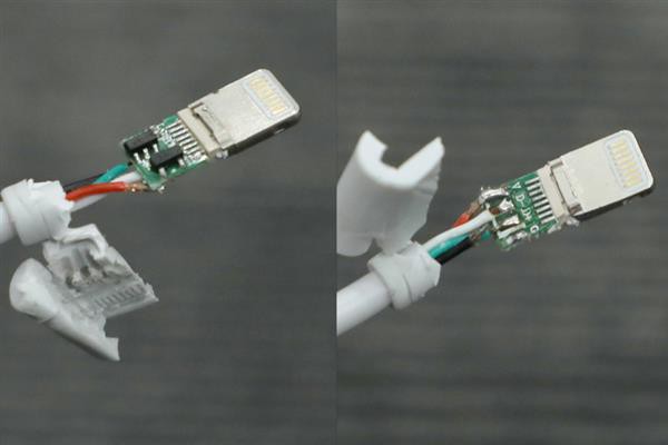 Sau khi tước vỏ, các chip hàn và khớp hàn cũng hiển thị rõ ràng. Ở cáp giá rẻ thường là hai con chip có mã "3401" và chip "HX10N" (màu đen). Với các phụ kiện chính hãng của Apple, chúng cần được chứng nhận MFi để được các thiết bị chạy iOS cho phép kết nối. Hai con chip trên dây giá rẻ được thiết kế để đánh lừa hệ thống chứng nhận này. Trong khi đó ở cáp xịn, toàn bộ phần bảng mạch được bảo vệ bởi một lớp vỏ kim loại và rất khó tiếp xúc với chi tiết bên trong.