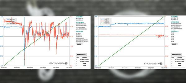 Trên thực tế, vấn đề không nằm ở tốc độ sạc pin. Biểu đồ dưới đây ghi lại điện áp và công suất hai dây sạc trong quá trình thử nghiệm. Bên trái là đồ thị của cáp sạc giá rẻ, có thể được mô tả bằng hai từ "khủng khiếp". Trong khi đó, đồ thị bên phải của cáp iPhone xịn cho thấy các đường cong ổn định và tạm có thể gọi là "mượt mà".