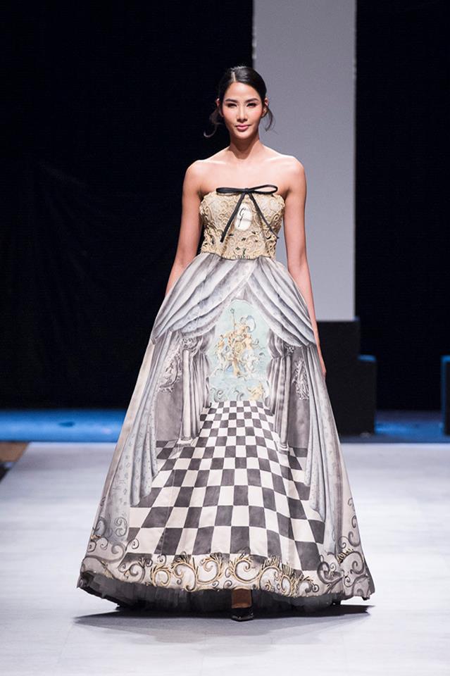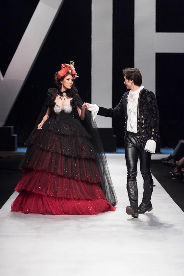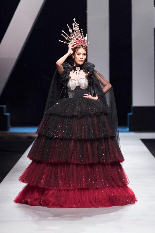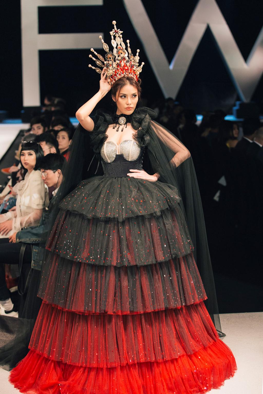 Lan Khuê đảm nhận vai trò vedette cho nhà thiết kế Vincent Đoàn. Bộ trang phục mang đến hình ảnh nữ hoàng quyền lực hoàn toàn hợp gương mặt lạnh của người đẹp sinh năm 1992.
