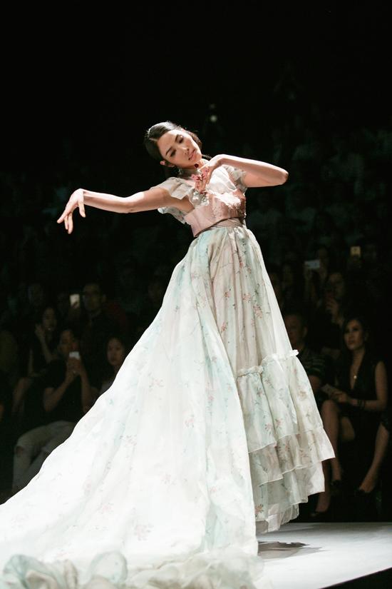 Tận dụng phần đuôi váy dài 5m, người đẹp có cú tung váy đẹp tuyệt.