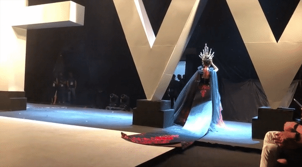 Để phần trình diễn thêm cuốn hút, Á hậu còn thể hiện một số động tác múa và màn tháo chạy như bị rượt đuổi vào phía sau cánh gà.