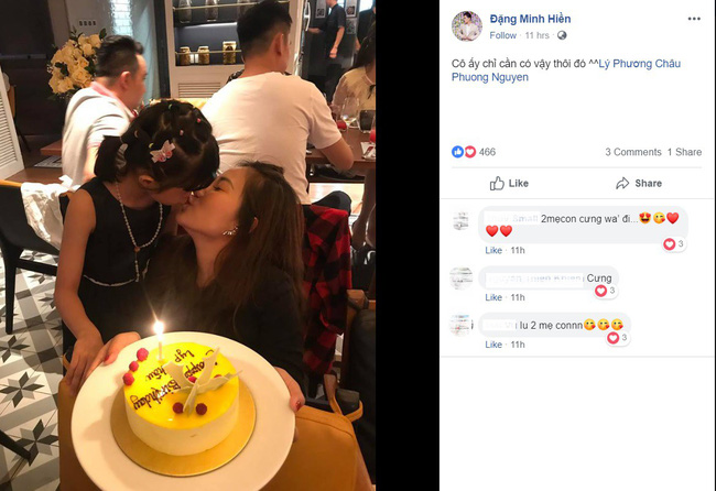 Bữa tiệc không có những món quà xa xỉ hay tổ chức hoành tráng, Hiền Sến mời Lý Phương Châu và con gái Kì Kì ra nhà hàng và tặng cô một chiếc bánh gato nhỏ. Chia sẻ bức ảnh mẹ con Lý Phương Châu đang âu yếm hôn nhau, Hiền Sến viết: "Cô ấy chỉ cần có vậy thôi đó".