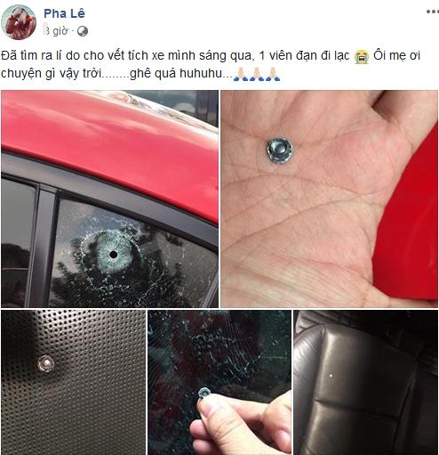 "Đã tìm ra lý do cho vết tích xe mình sáng qua, 1 viên đạn đi lạc... ôi mẹ ơi chuyện gì vậy trời.... ghê quá", Pha Lê hốt hoảng chia sẻ.