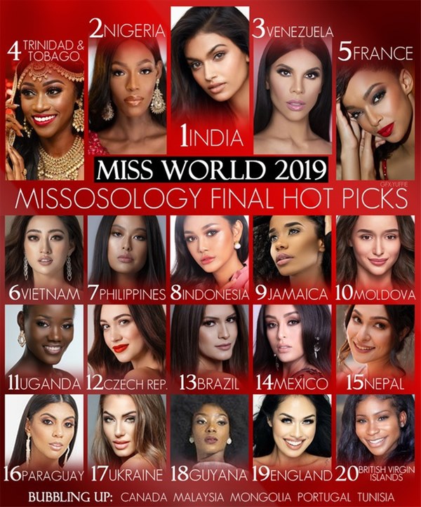Trước giờ G, chuyên trang Missosology đưa ra bảng đánh giá. Theo đó, người đẹp Ấn Độ Suman Rao được đánh giá là ứng viên tiềm năng nhất. Cô chiến thắng phần thi Head to Head (Đối đầu) và cũng có mặt trong top 10 dự án nhân ái. Với những gì thí sinh này đã thể hiện, cô được cho là có khả năng chiến thắng vương miện Miss World lần thứ bảy cho Ấn Độ. Cách đây 19 năm, khi Hoa hậu Thế giới diễn ra tại London, Priyanka Chopra đăng quang và được cổ vũ nồng nhiệt.