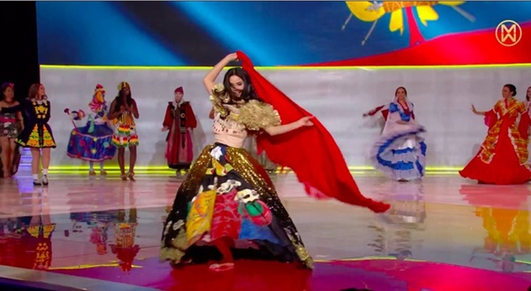 Ngay sau đó là vũ điệu Dances of The World quen thuộc. Các thí sinh mặc trang phục truyền thống, thể hiện điệu múa đặc trưng của đất nước mình.