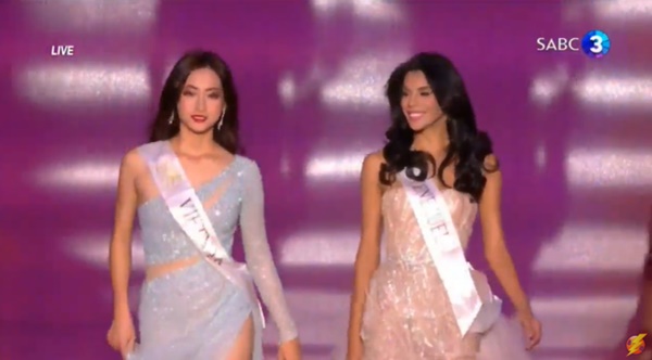 Lương Thùy Linh trình diễn trang phục dạ hội ở Miss World: Sau khi lọt top 40, Hoa hậu Lương Thùy Linh có phần trình diễn trang phục dạ hội cùng người đẹp đến từ Venezuela. Người đẹp Cao Bằng diện mẫu đầm màu xanh, xẻ cao khoe chân dài.