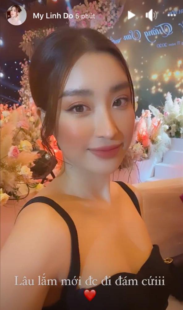 Hoa hậu Đỗ Mỹ Linh diện váy cúp ngực, khoe visual đi ăn cưới xinh đẹp chẳng thua chị kém em