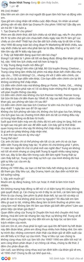 Tối 18/4, trên trang cá nhân của mình, đạo diễn 1990 là Nhất Trung đã chia sẻ thông tin gây bất ngờ khi tác phẩm sẽ dời ngày khởi chiếu thay vì 21/4 như đã ấn định trước đó. Thông qua đó, đạo diễn dường như muốn "trải lòng tâm sự" về câu chuyện của bản thân với một ngôi sao nổi tiếng Việt Nam (gọi tắt là A).