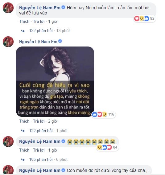 Giữa tâm bão, Hoa khôi Nam Em còn tìm đến mộ cha và cầu xin: "Con chỉ xin cha cho con có thêm thời gian và sức mạnh để thực hiện ước mơ của mình". Bên dưới phần bình luận, Nam Em cũng than buồn sau khi bị nhiều người chỉ trích. Dân mạng tự hỏi phải chăng vì quá mệt mỏi trước thị phi không đáng có nên Nam Em đã về quê để thoải mái hơn?