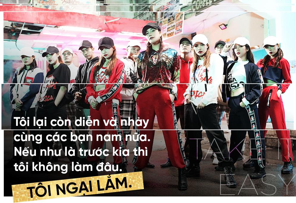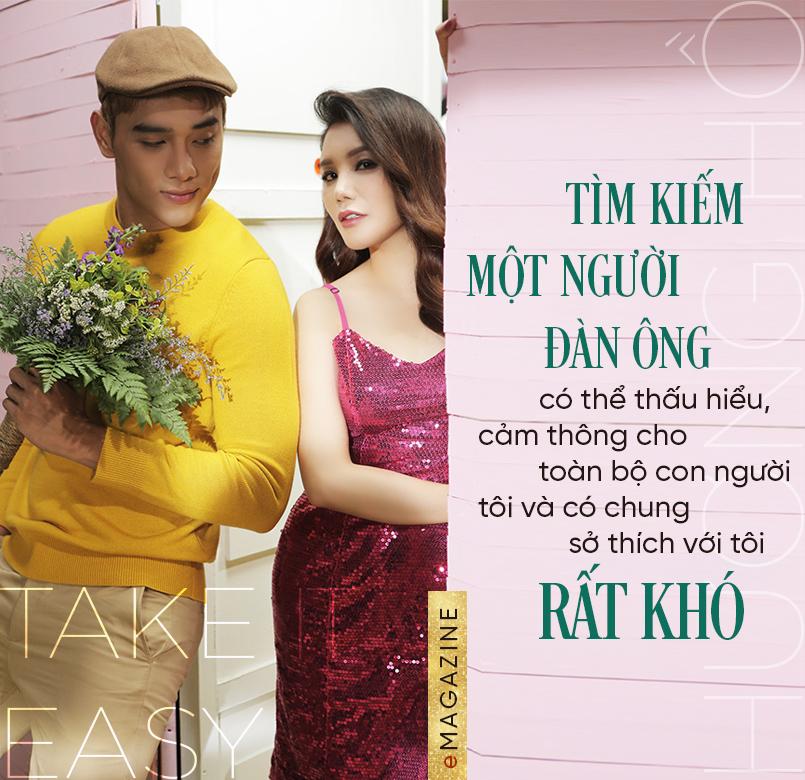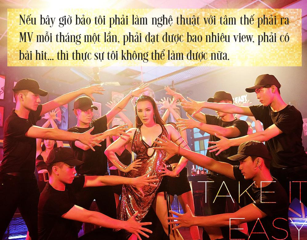 - Ra MV mới sau khá lâu thời gian yên ắng, chị kỳ vọng thế nào về sản phẩm lần này "Take it easy"? Đạo diễn Đinh Hà Uyên Thư là người rất khó tính trong công việc. Ngay từ đầu, cả đạo diễn và ekip đều lo lắng tôi sẽ bị đơ và không thể thể hiện tốt nhưng cuối cùng, mọi chuyện vẫn kết thúc tốt đẹp. Tất nhiên tôi không thể so sánh với các diễn viên chuyên nghiệp. Quan trọng là tôi đã làm tốt nhất khả năng và khiến mọi người bất ngờ. Tôi cũng hy vọng bài hát của tôi sẽ đem đến nhiều sự thú vị cho khán giả. Công chúng có thể nhìn thấy sự thay đổi tích cực của tôi sau thời gian dài vắng bóng. Từ trước giờ tôi chỉ thường xuyên hát thể loại pop ballad nhưng lần trở lại này lại là một ca khúc nhạc dance sôi động. Tôi lại còn diễn và nhảy cùng các bạn nam nữa. Nếu là trước kia, tôi không làm đâu vì ngại lắm. |