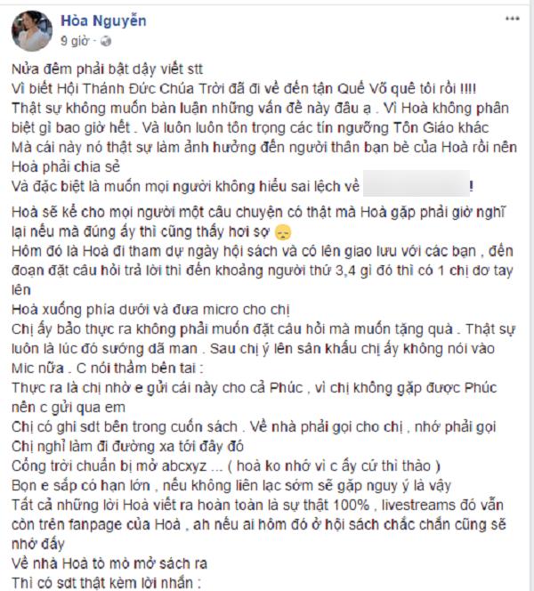 'Thực ra chị nhờ em gửi cái này cho cả Phúc vì chị không gặp được Phúc nên chị gửi qua em. Chị có ghi số điện thoại bên trong cuốn sách. Về nhà phải gọi cho chị. Chị nghỉ làm đi đường xa tới đây đó. Cổng trời chuẩn bị mở abcxyz ... ( Tôi không nhớ vì chị ấy cứ thì thào). Bọn e sắp có hạn lớn, nếu không liên lạc sớm sẽ gặp nguy...' ý là vậy", Hòa Minzy nhớ lại.