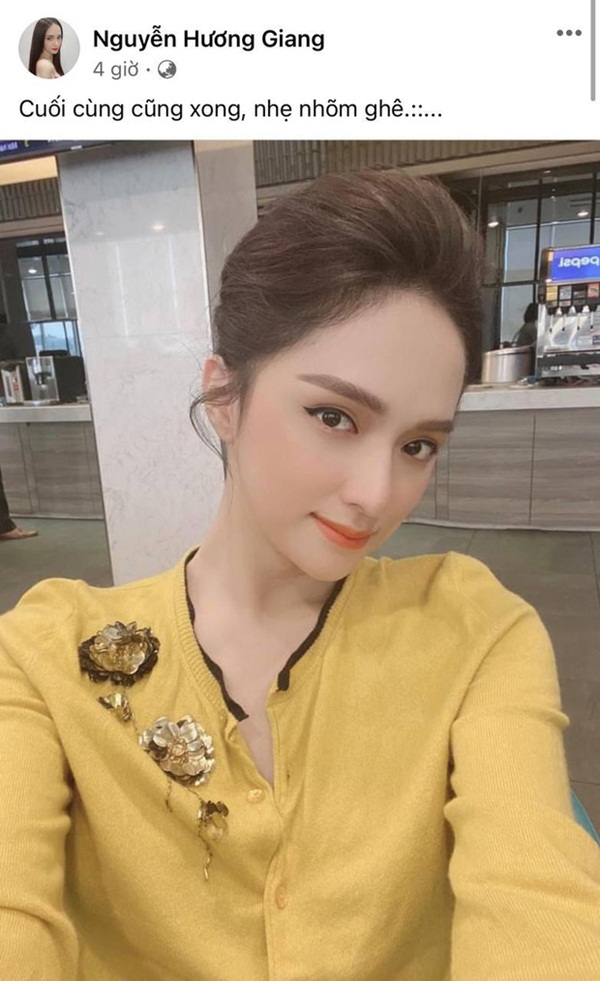 Giữa hàng loạt drama đang diễn ra, Hương Giang đã có động thái gây chú ý trên trang cá nhân. Theo đó, nàng hậu đã đăng bức ảnh khoe nhan sắc xinh đẹp, mỉm cười rạng rỡ kèm chia sẻ: "Cuối cùng cũng xong, nhẹ nhõm ghê". Dân mạng cho rằng Hương Giang đang nhắc đến chương trình Đại Sứ Hoàn Mỹ được cô đặt nhiều tâm quyết đã kết thúc thành công mỹ mãn. Tuy nhiên, 1 số khác lại cho rằng đây là cách Hương Giang cố tình phớt lờ loạt ồn ào.