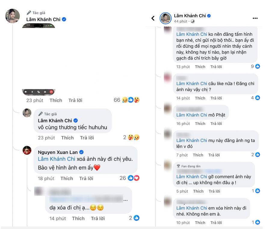 Theo đó, nhiều người không đồng tình với việc Lâm Khánh Chi đăng tải công khai khoảnh khắc cuối đời của đồng nghiệp. Đa phần netizen đều khuyên Lâm Khánh Chi nên tháo bỏ hình ảnh này để giữ hình tượng đẹp của người quá cố trong mắt công chúng. Thậm chí, cư dân mạng còn để lại nhiều bình luận chỉ trích cho rằng cô quá vô cảm, cố tình công khai hình ảnh để "câu" tương tác. Không chỉ khán giả mà siêu mẫu Xuân Lan cũng nhắc nhở Lâm Khánh Chi: "Xoá ảnh này đi chị, bảo vệ hình ảnh của em ấy". Tuy nhiên, sau hơn 1 giờ, cô vẫn không có động thái gỡ hình ảnh này trên trang cá nhân.