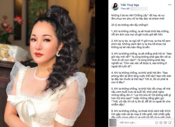 Trên trang cá nhân, Thúy Nga trích dẫn lại 20 lý do không nên lấy chồng do đạo diễn Lê Hoàng đúc kết. Thông qua bài viết, danh hài cũng thể hiện sự đồng tình và rất tâm đắc với quan điểm của Lê Hoàng. Vốn là nghệ sĩ có đời tư khá phức tạp khi trải qua một đời chồng, tiết lộ từng yêu người đồng tính và nay đang làm mẹ đơn thân ở tuổi 42, chia sẻ của Thúy Nga nhanh chóng thu hút đông đảo sự quan tâm.