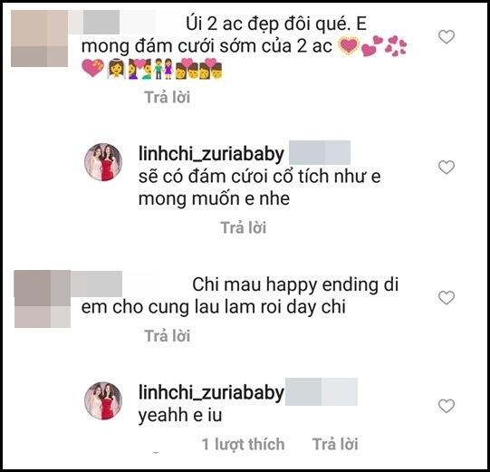 Trước đó không lâu, người đẹp 28 tuổi cũng tiết lộ sẽ có một đám cưới cổ tích với Lâm Vinh Hải khi trả lời bình luận của người hâm mộ. "Sẽ có đám cưới cổ tích như em mong muốn nhé", "Sẽ cưới nha em yêu của chị"..., cô viết.