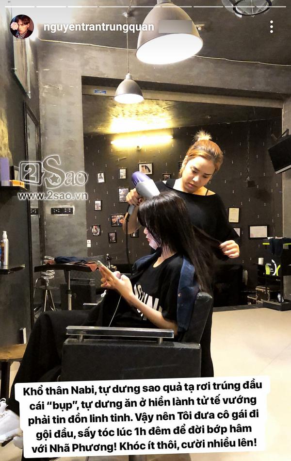 Nói về người bạn, Trung Quân cho biết Nhã Phương đã rất buồn sau khi vướng "tai bay vạ gió". "Khổ thân Nabi, tự dưng sao quả tạ rơi trúng đầu cái bụp. Tự dưng ăn ở hiền lành tử tế vướng phải tin đồn linh tinh. Vậy nên tôi đưa cô gái đi gội đầu, sấy tóc lúc 1 giờ đêm để đời bớt hâm với Nhã Phương. Khóc ít thôi, cười nhiều lên", Trung Quân nhắn nhủ cô bạn thân thiết.