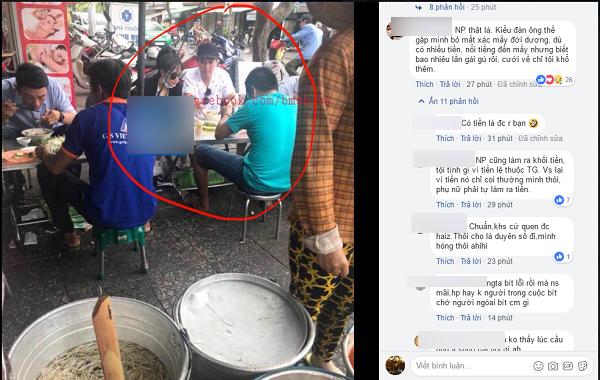 Đính kèm đó là hình ảnh chụp Trường Giang cùng một cô gái đang ngồi ăn trong quán bún. Mặc dù cô gái bên cạnh được che chắn khá kỹ lưỡng nhưng fanpage khẳng định người này là Nhã Phương.