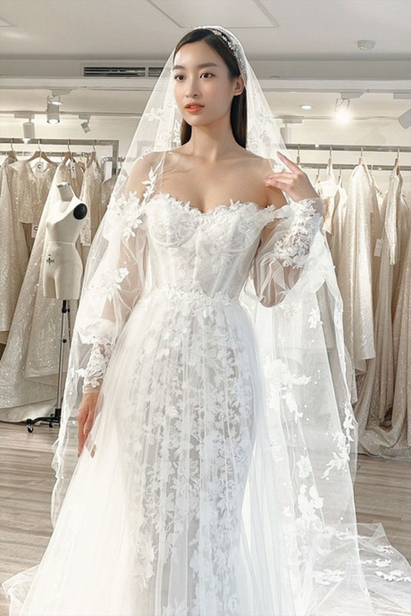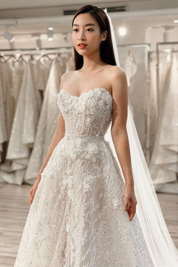Mới đây hình ảnh nàng hậu đi thử váy cưới cũng được tiết lộ. Hoa hậu Mỹ Linh thử 4 mẫu váy cúp ngực khoe vai trần của một thương hiệu ở Hà Nội. Bốn mẫu đầm mà Đỗ Mỹ Linh dùng chụp ảnh cưới sử dụng chất liệu lần lượt gồm ren, mikado, satin và đính kết swarovski. Một trong số này đã được cô dùng trong ảnh cưới công bố với công chúng. Mẫu váy người đẹp diện trong khoảnh khắc bước vào lễ đường hiện vẫn chưa được hé lộ.