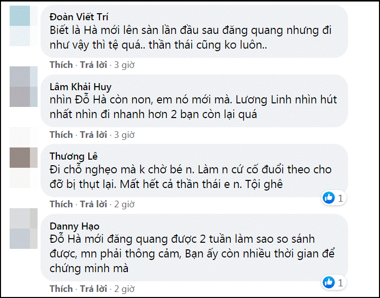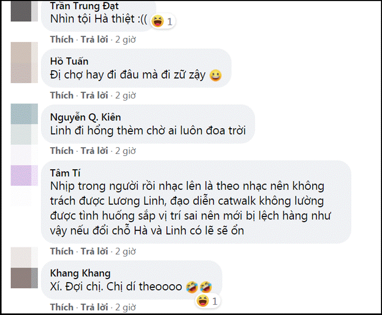 Một số bình luận trên mạng dành cho Đỗ Thị Hà: "Còn phèn nhiều lắm, từ từ mới rửa"; "Mặt đúng kiểu vẫn còn sợ"; "Coi mặt Hà thấy mệt mỏi ghê"; "Đỗ Thị Hà đánh tay cũng không đẹp"; "Khổ thân, chỉ biết đuổi cho kịp"; "Đỗ Hà như muốn xách đôi guốc chạy theo"; "Biết mới lần đầu catwalk nhưng đi vậy tệ quá, thần thái cũng không luôn"...