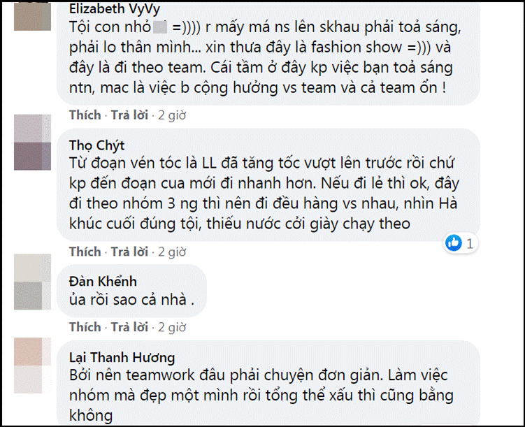Lương Thùy Linh nhận được nhiều chê bai: "Lương Linh thần thái thật nhưng lấn lướt đàn em và không xem đội hình gì cả. Bộ đồ của Lương Linh cũng dễ đi nhanh hơn, mà không đợi em út"; "Hà đã làm gì luyện được cảm nhạc, có muốn đi nhanh chắc gì đã biết đi, 2 bạn kia có kinh nghiệm phải biết cách xử lý hơn chứ";