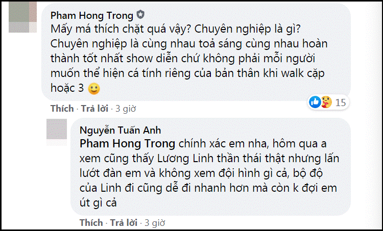 "Đi chậm lại nương bạn diễn mới là cái trình, hãy xem Quang Đại đợi Hoàng Thùy ngay trong show này"; "Chuyên nghiệp là cùng nhau tỏa sáng, cùng nhau hoàn thành tốt nhất show diễn chứ không phải thể hiện cá tính riêng khi bước cặp hoặc 3"...
