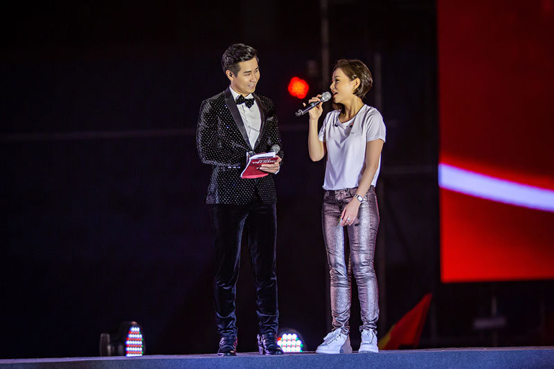 Hai MC giao lưu cùng các Huấn luyện viên - những người truyền lửa cho những vận động viện toả sáng .