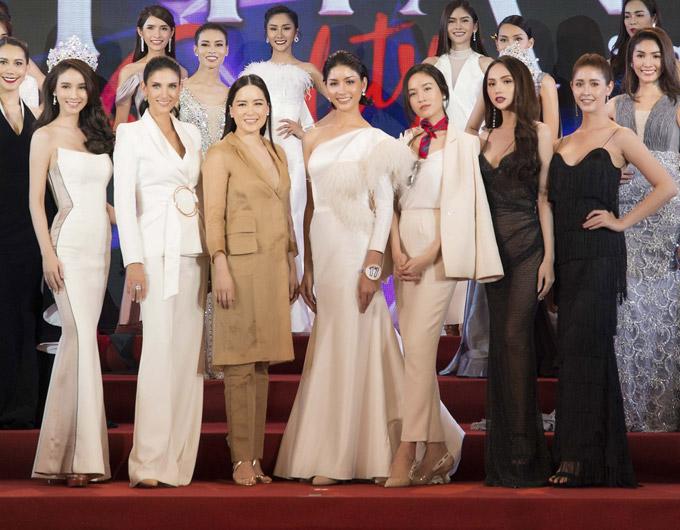 Lần đầu chụp hình cùng đệ nhất Hoa hậu Chuyển giới Nong Poy (thắt khăn đỏ), Hương Giang vẫn không lép vế nhờ giày "khủng". Trên thực tế, cô kém Nong Poy tới 5 centimet.