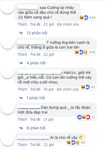 Cư dân mạng hài hước bình luận: "Nhìn tưởng 2 vợ chồng có đứa con trai lớn ở giữa", "Ai là chú rể vậy?", "Sao Cường lại nhảy vào giữa cô dâu chú rể đứng thế?"...