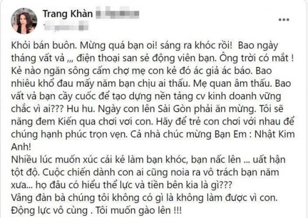 Cụ thể, Trang Trần đã viết: "Khỏi bán buôn. Mừng quá bạn ơi, sáng ra khóc rồi. Bao ngày tháng vất vả điện thoại san sẻ động viên bạn. Ông trời có mắt, kẻ nào ngăn sông cấm chợ mẹ con kẻ đó ác giả ác báo. Bao nhiêu khổ đau mấy năm bạn chịu ai thấu. Mẹ quan âm thấu. Bao vất vả bạn cày cuốc để tạo dựng nền tảng công việc kinh doanh vững chắc vì ai. Ngày con lên Sài Gòn phải ăn mừng. Tôi sẽ đem Kiến qua chơi vơi con. Hãy để trẻ con chơi với nhau để chúng hạnh phúc trọn vẹn. Cả nhà chúc mừng bạn em Nhật Kim Anh.
