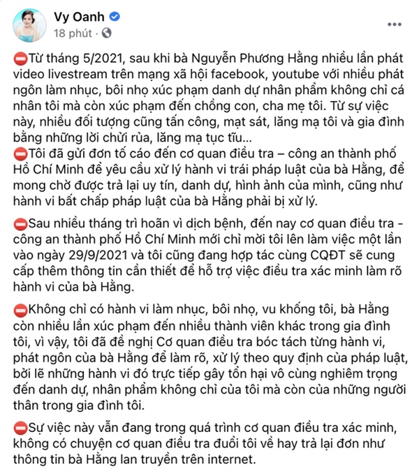 Đến tối ngày 3/10, Vy Oanh tiếp tục đăng tải dòng trạng thái dài nhằm làm rõ về vụ kiện của mình. Nữ ca sĩ cho biết cơ quan điều tra đã gọi mình lên làm việc vào ngày 29/9.