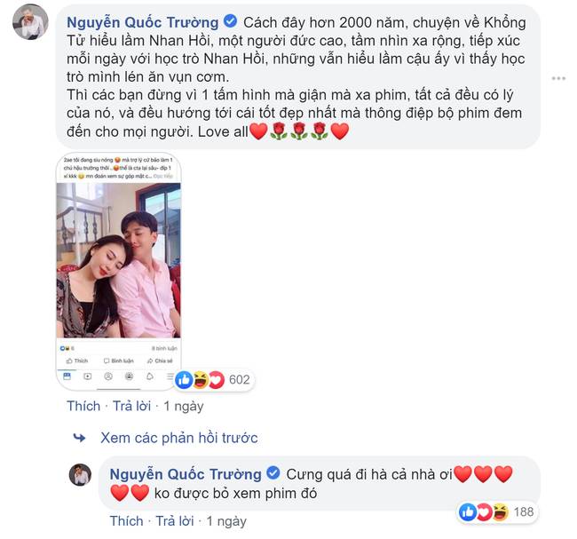 Không đành lòng để khách mời hứng chịu chỉ trích từ dư luận, mới đây Quốc Trường đã lên tiếng bênh vực hotgirl sinh năm 2000 này. Cụ thể, nam diễn viên cho biết: "Các bạn đừng vì 1 tấm hình mà giận mà xa phim, tất cả đều có lý của nó, và đều hướng tới cái tốt đẹp nhất mà thông điệp bộ phim đem đến cho mọi người. Love all."